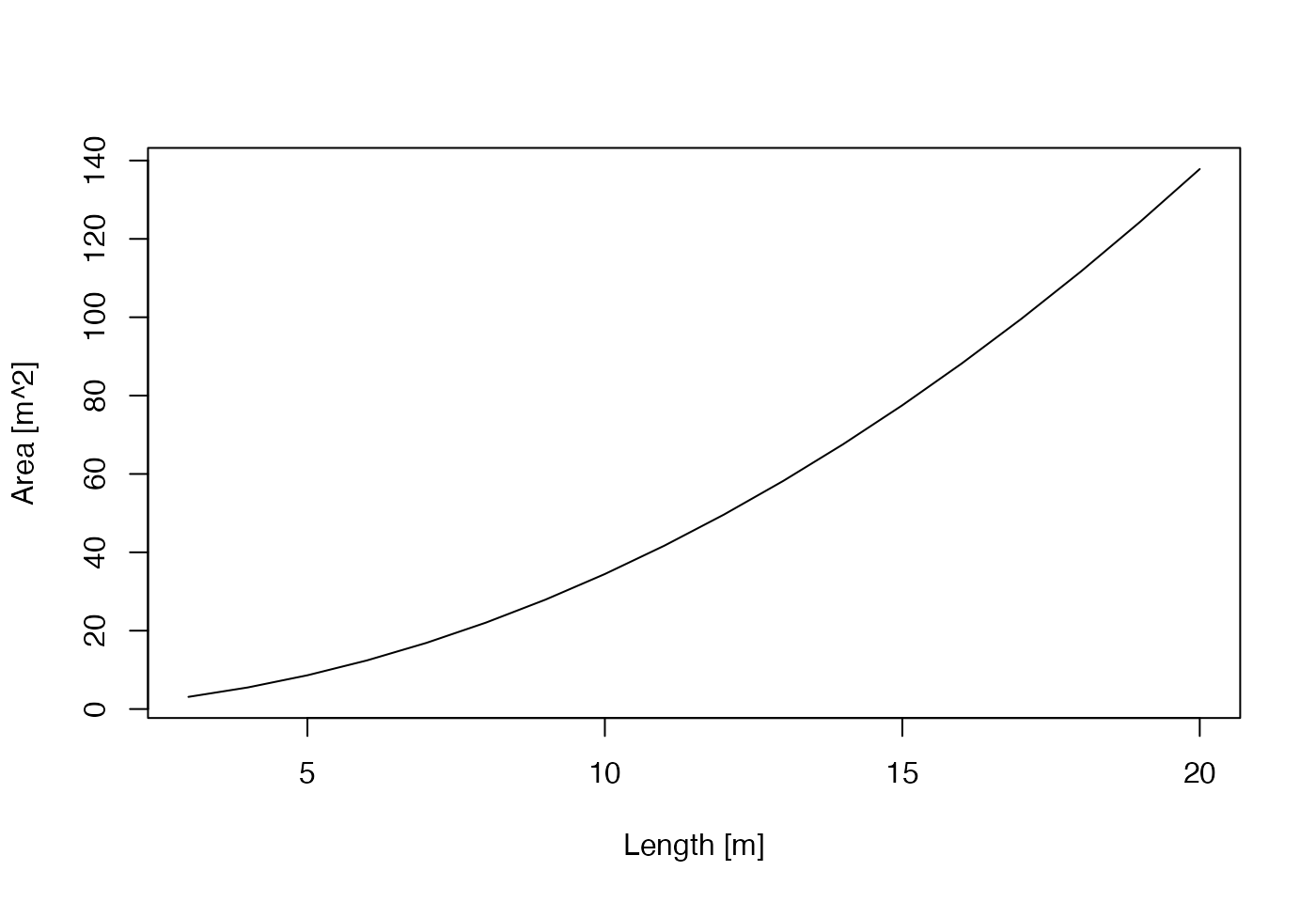 plot(L, A, xlab = "Length [m]", ylab = "Area [m^2]", type = "l")
